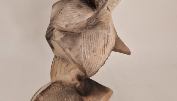 verkopfter Kopf (20 cm h) / Rakutechnik, innen glasiert, aus Dreieckselementen frei aufgebaut